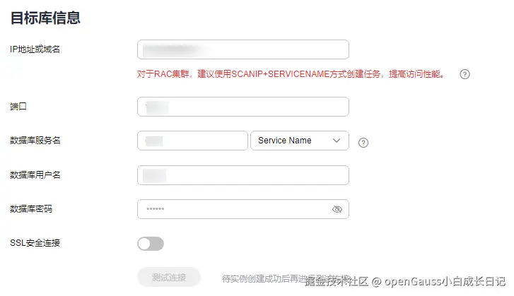 对于RAC集群,建议使用SCANIP+SERVICENAME方式创建任务,提高访问性能。