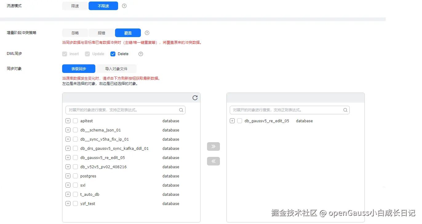 流速模式支持限速和不限速,默认为不限速。限速模式只对全量阶段生效,增量阶段不生效。