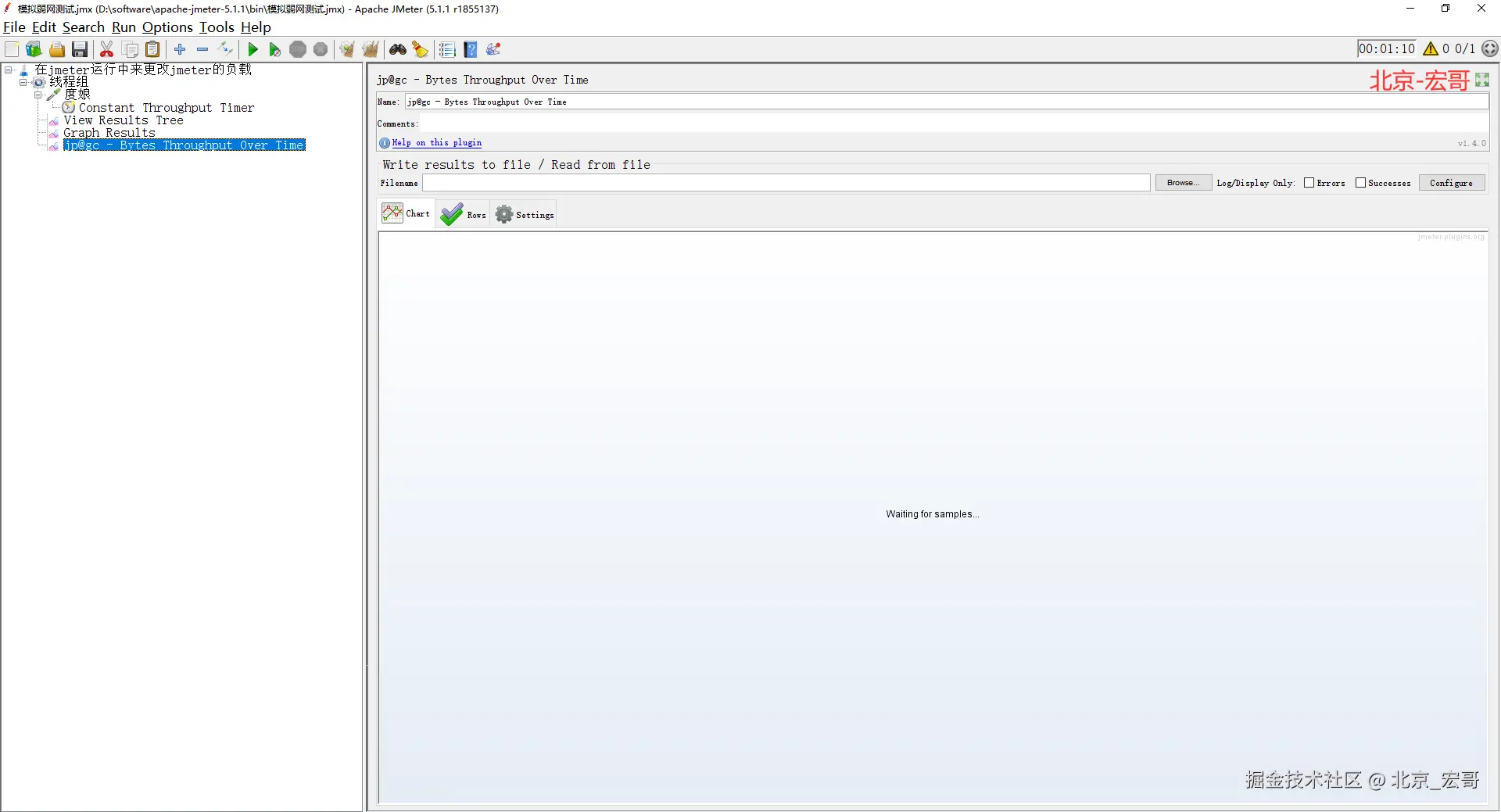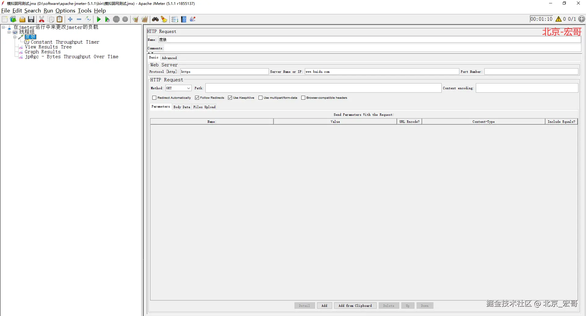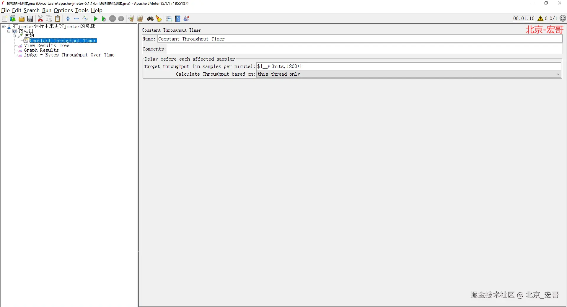从文字中,我们很容易看出意思就是在jmeter测试运行脚本过程中,但是在不停止运行脚本的情况下修改jmeter的负载压力,来达到我们预期的测试效果。大致步骤就是:宏哥将通过Constant Throughput Time(吞吐量计时器)、一个函数和BeanShell服务器组合完成jmeter的运动战。具体步骤如下: