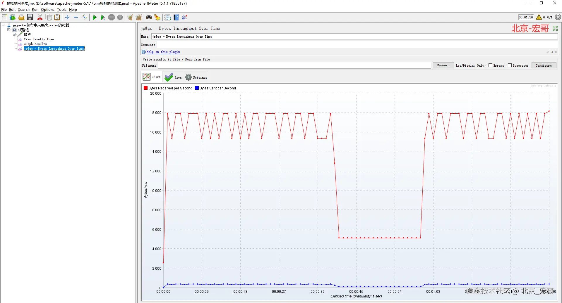 小伙伴们可能按照宏哥的步骤做完后,没有看到宏哥的效果,其实宏哥第一次运行也没有看到。排查了一圈没有问题啊,到底是哪里出问题了,没有达到预期的效果。然后宏哥将线程组里用户修改成10以后,出现了预期的效果,宏哥猜测可能是由于一个用户,吞吐量120已经够用了,所以从1200变成120,再变成1200基本是一条直线,没有什么变化。知道内在原理或者宏哥说的不对的,可以告诉宏哥或者指出来,宏哥及时纠正。