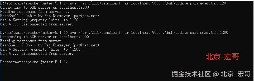 使用JMeter Beanshell作为服务器,以便发出Beanshell命令。我们通过调用beanshell函数来更新先前定义的“hits”参数。Beanshell是一个内置于JMeter中的Java源代码解释器。