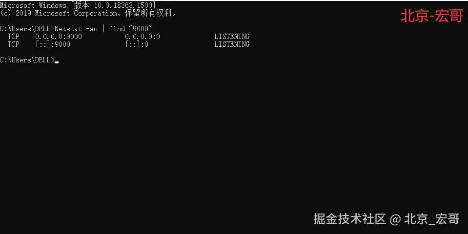 2、重启jmeter,docs命令窗口输入:Netstat -an | find “9000” 命令查看端口运行状态,如下图所示: