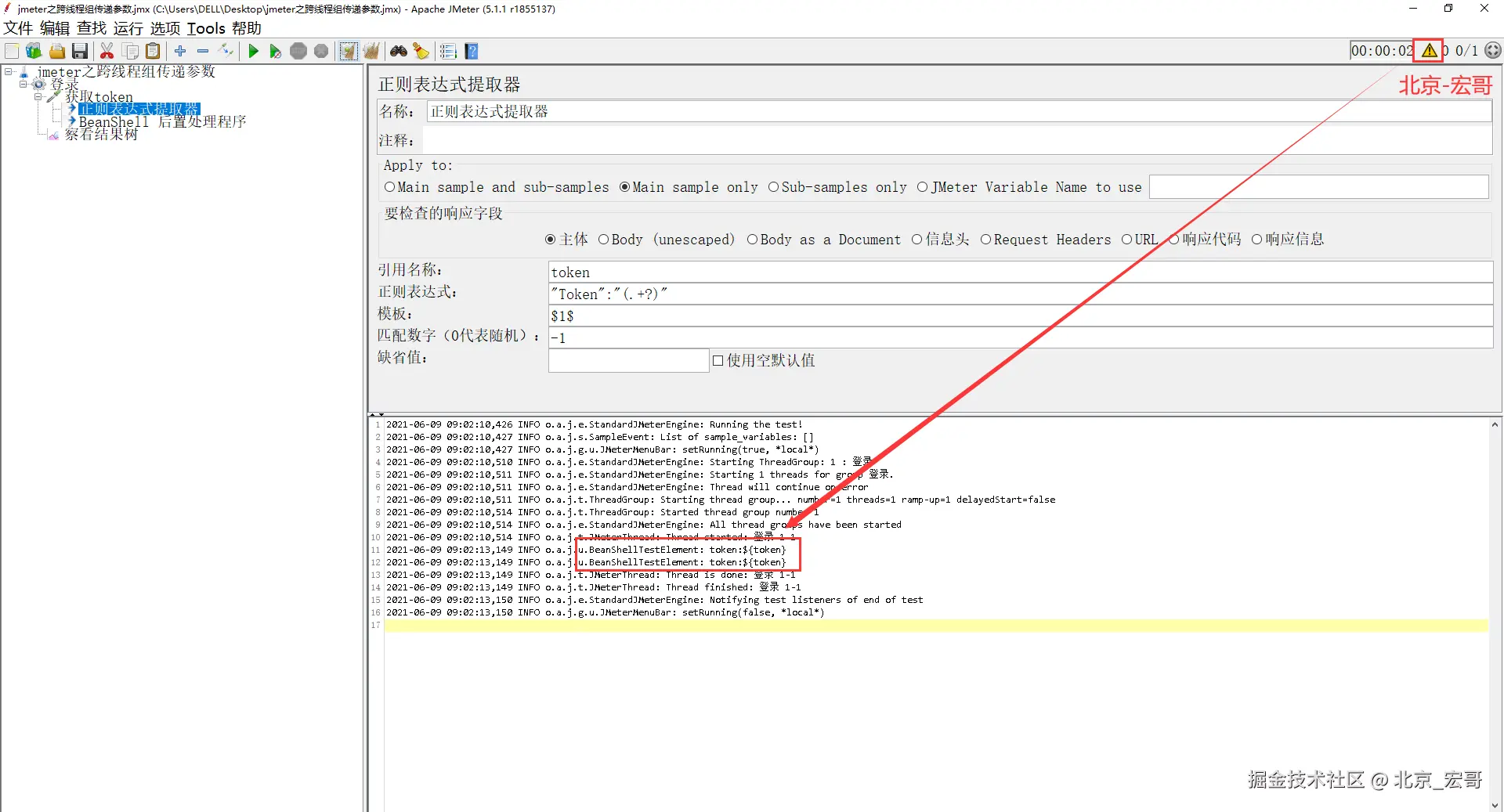 8、从上边的日志中我们清楚的发现没有提取到token的值,宏哥查看正则表达式提取器发现匹配数字是-1,这里有问题,将其修改成1,运行测试计划,再次查看日志,如下图所示: