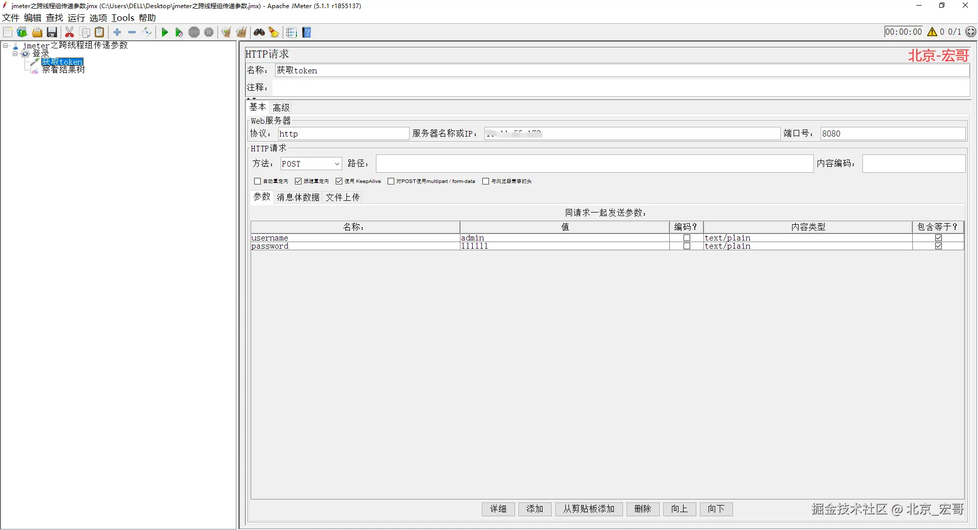 首先往往我们接到一个性能测试任务需要对某一个接口进行压测时不需要每一次请求都取登录(如果每次都登录这样就会影响测试结果),那么遇到这种情况我们就要通过登录接口获取token(session、cookie)了,然后用另一个线程组进行压测。