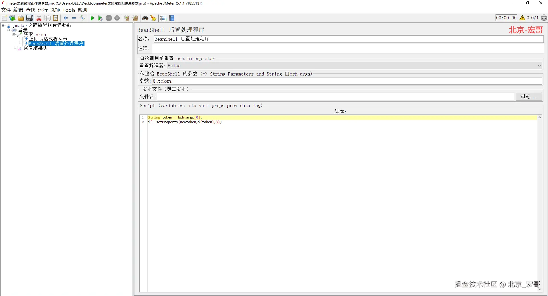 6、根据上边思路,提取出来就要加入到属性中,加入属性中,宏哥这里使用后置处理器-BeanShell后置处理器,选中获取token,右键添加BeanShell后置处理器,然后进行配置,添加脚本。如下图所示: