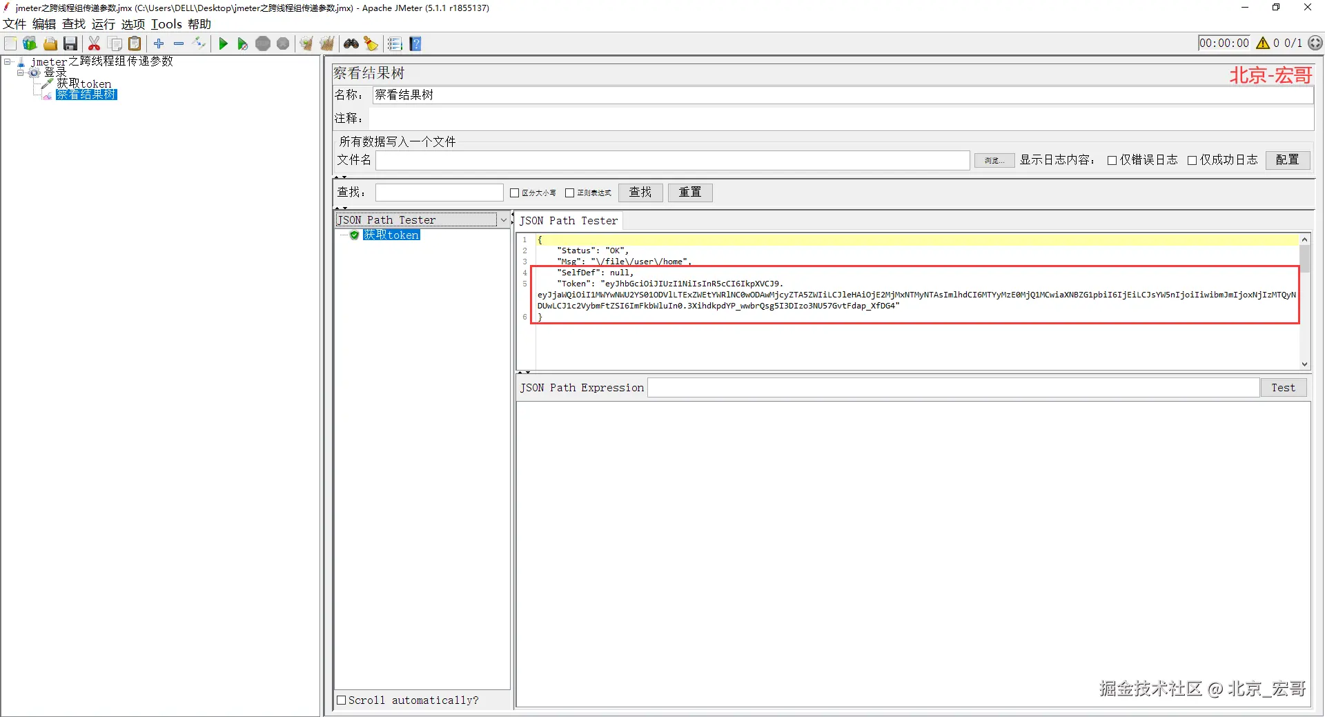 从第三步可以看到宏哥已经成功获取到token了,紧接着就是要将token提取出来,然后再将token设置到属性中,这样其他线程组就可以调用了。