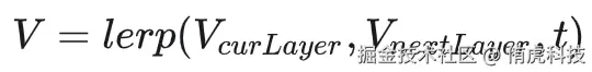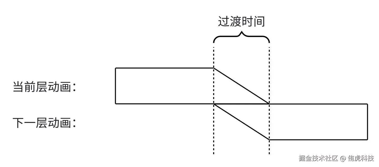 排好序的动画曲线,在同一个PropertyType分组内,就可以计算当前播放层的动画是否即将结束,如果动画即将结束了,下一层动画就不要跳过执行。下一层动画执行的结果和当前层动画的执行结果进行线性差值,使层和层之间的动画过渡也变得平滑:
