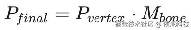 首先从程序的角度来思考,如果要实现骨骼动画,最简单的办法就是所有骨骼初始都处于模型坐标系的原点,这样计算会很简单。因为AnimationClip的每一帧数据,保存的就是对应骨骼的变换矩阵,我们标记为Mbone。动画播放到某一帧,直接读取这一帧对应骨骼变换矩阵,乘以绑定到这个骨骼的所有顶点的初始坐标Pvertex,就可以获得顶点的最终坐标Pfinal。即: