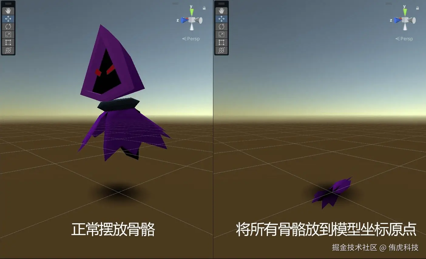如果程序是这么实现骨骼蒙皮动画的话,那美术人员就该反对了,因为把骨骼全部放到模型坐标系的原点,这个模型就没法看了,如下图所示。