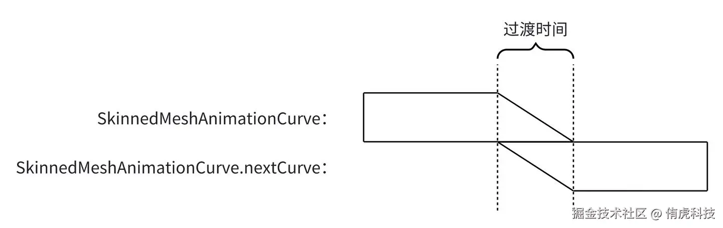 当过渡时间结束,将会用SkinnedMeshAnimationCurve.nextCurve替换原来的SkinnedMeshAnimationCurve。