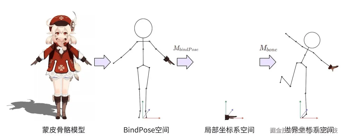 下图以角色手部的空间变换为例,展示骨骼蒙皮到动画播放的完整变换过程。
