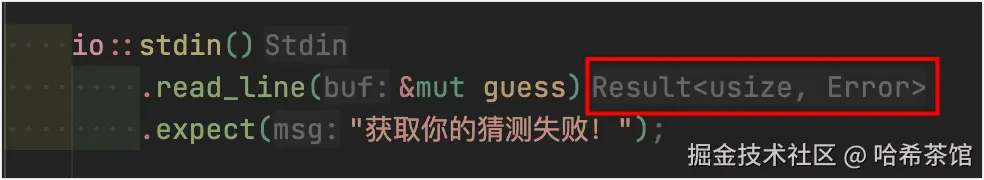 如果你使用的vscode,并且按照第一节的要求安装好rust-analyzer插件的话,你应该能看到read_line方法的返回值是一个Result模样的东西: