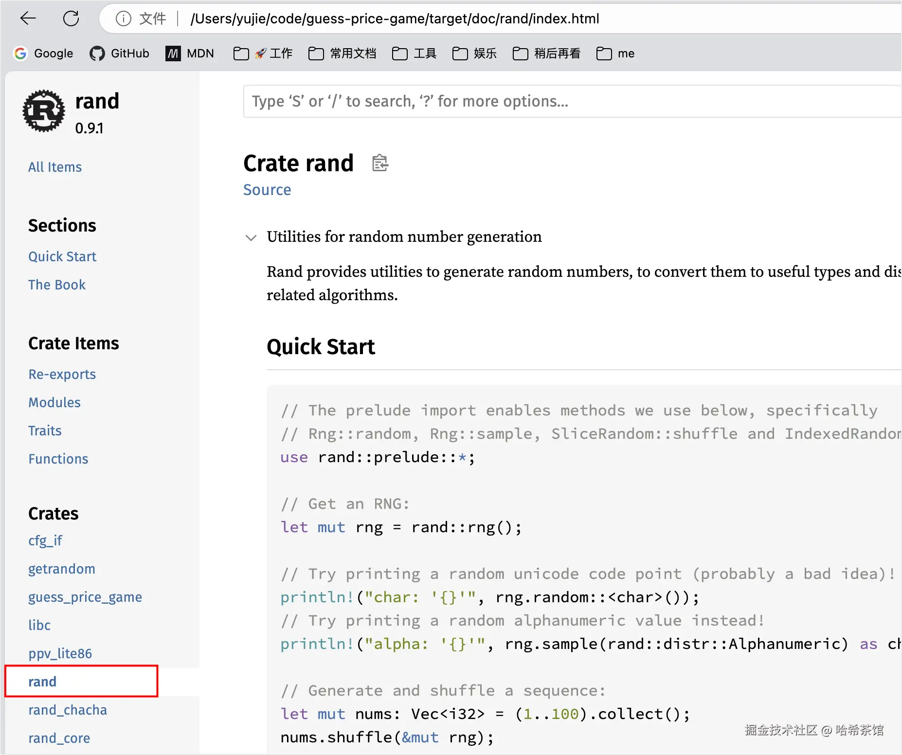 对于rand的文档,你可以直接到crates.io查看,也可以本地运行cargo doc --open来查看rand的文档