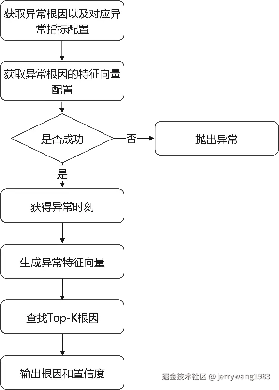 针对生成的特征向量,系统从异常特征库中获取近似包含的所有特征向量,并且根据相似度返回最有可能的K个特征向量对应的异常根因。