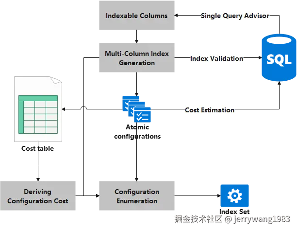 (2)基于步骤一的候选索引中的候选列,依次从单列逐渐递增到多列,迭代地生成多列索引。在每次迭代过程中,采用虚拟索引+优化器估计的方式对该多列索引进行验证和评估;重复步骤一和步骤二,生成的多列(单列)索引共同组成候选索引集合;