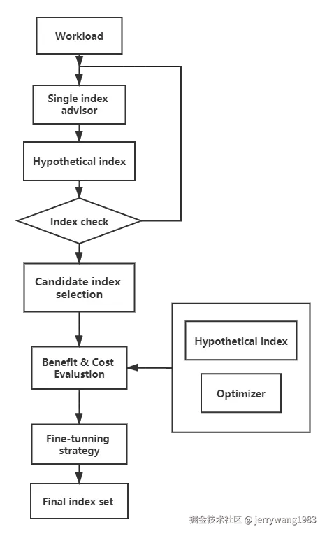 Workload索引推荐是针对给定的负载,给出一批符合该负载状况下的最优索引组合。推荐后的索引,不一定对所有执行语句都有正向收益,但对整批负载的收益是正向的。在Workload级别索引推荐中,主要包括两个核心功能,一是虚拟索引的设计,二是workload级别索引推荐算法设计。Workload索引推荐执行流程图如下: