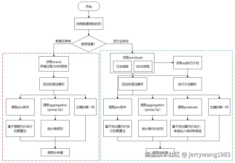 分布键推荐功能根据时间节点划分,可划分为两种使用场景,一是在数据迁移前,可支持两种数据格式,一种是基于友商数据库中的存储过程和少量关于数据分布的统计信息,另一种是基于友商数据库的统计报告和少量关于数据分布的统计信息进行初步的分布键推荐;该场景可以在迁移工具进行集成,在迁移过程中,调用该工具完成业务迁移。二是在完成数据迁移并运行一段时间业务后,基于真实的工作负载和优化器的代价估计,进一步改进和完善分布键的推荐结果。
