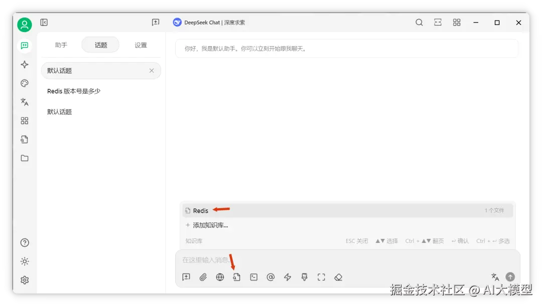 完成上述操作后,返回 Cherry Studio 左侧菜单栏选择“助手”,然后新建对话。此时不关联知识库,直接用 DeepSeek Chat 询问“Redis 最新版本号是多少”。
