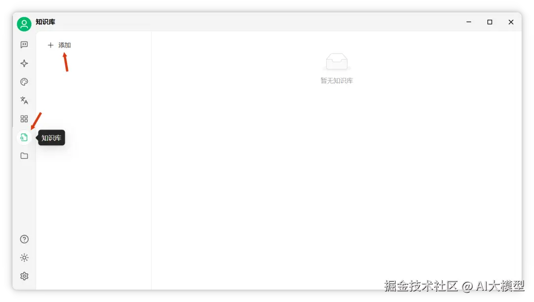 接着在 Cherry Studio 左侧菜单栏点击“知识库”,然后点击“添加”。