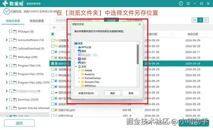 步骤3: 在【浏览文件夹】的弹窗中选择文件存放在电脑的另一个位置。