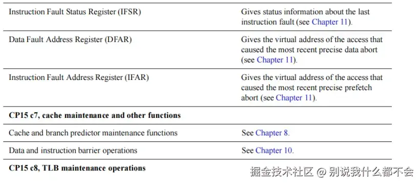 Memory protection and control registers,内存保护和控制寄存器,包含Translation Table Base Register 0 (TTBR0)、Translation Table Base Register 1 (TTBR1)和Translation Table Base Control Register (TTBCR)。TTBR0、TTBR1是L1转换页表的基地址,TTCR控制TTBR0和TTBR1的使用。