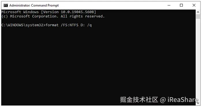 步骤 3: 在“命令提示符”窗口中,键入“ format /FS:<file_system> <drive_letter> /q ”。然后将“ <file_system> ”替换为所需的文件系统(例如, FAT32 、 NTFS 、 exFAT ),并将“ <drive_letter> ”替换为要格式化的磁盘或分区的实际驱动器号(例如, D: )。接下来,按“输入”。
