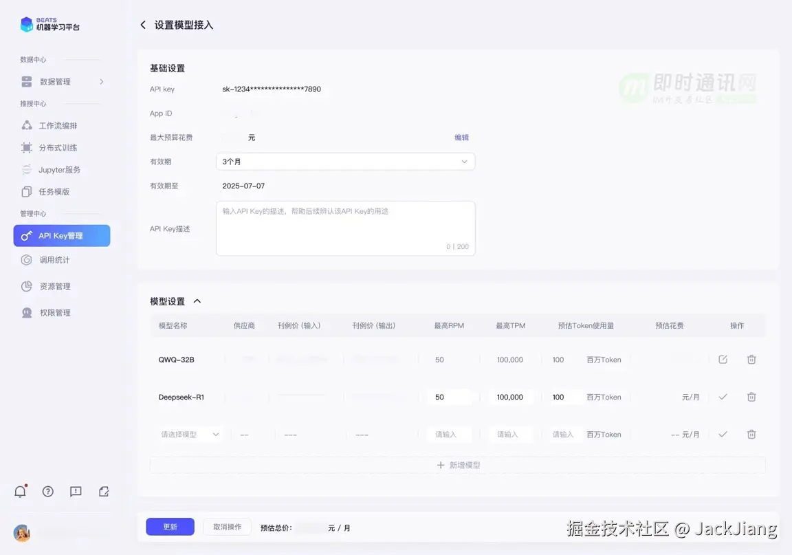 在这里可以按照为每个用户分配不同模型的 Token 配额,或指定单位时间的请求数限制,以确保 AI 服务的高效运行并防止超出预算。
