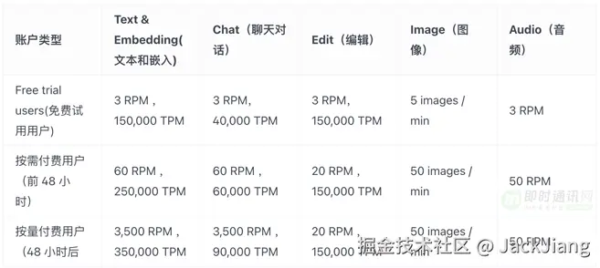 在配额管理体系里可以限制模型消费者的调用速率,在这里主要参考了 OpenAI 的配额策略: RPM(每分钟请求数)和 TPM(每分钟 Tokens 数)。