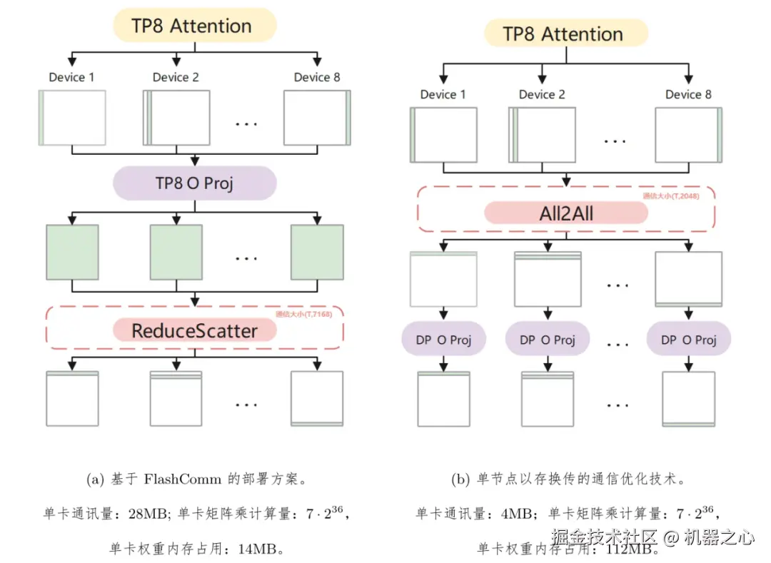 面对 TP+AllReduce 架构的通信瓶颈,团队发现了一个精妙的数学等价关系:通过调整矩阵乘法的并行维度,在保持计算结果精确性的前提下,将原本需要传输的三维张量「压扁」成二维矩阵。这种维度魔法配合 INT8 量化技术,使得 DeepSeek 模型在注意力机制转换阶段的通信量骤降 86%,整体推理速度提升 33%。