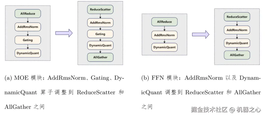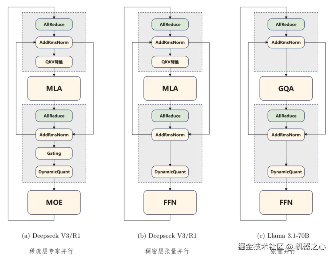 Transformer 结构中 AllReduce 算子之后,往往会有一些其他计算操作,如 RMSNorm、以及 MLA 中的降维计算等。这些计算过程会在不同卡上执行相同的计算操作,在小并发场景下可能耗时不高,但在大并发场景下,会带来不小的代价。