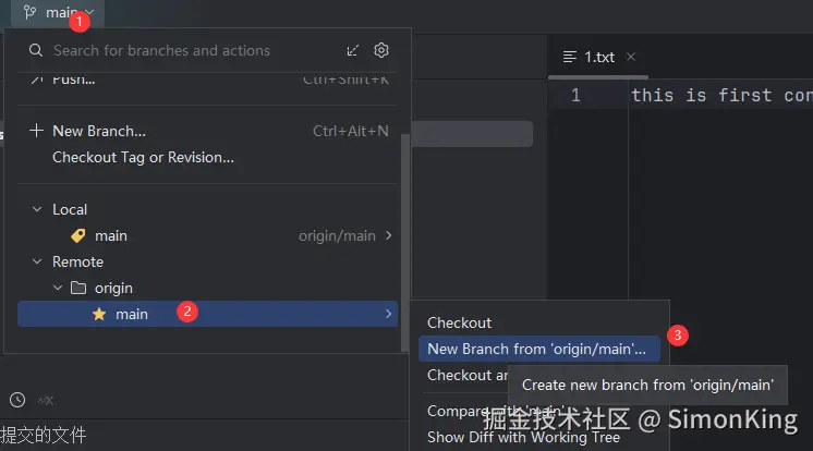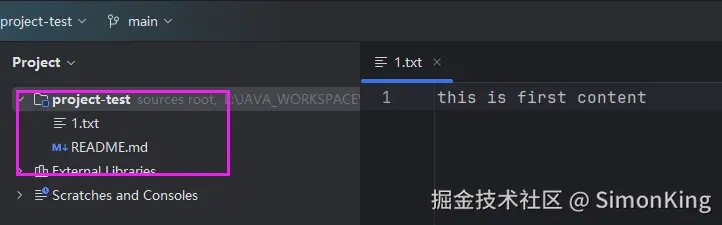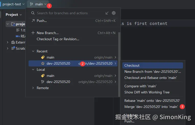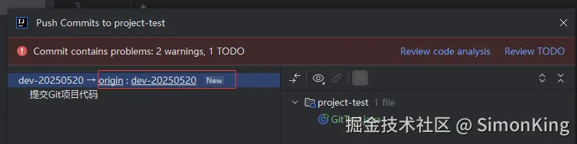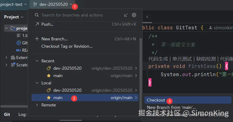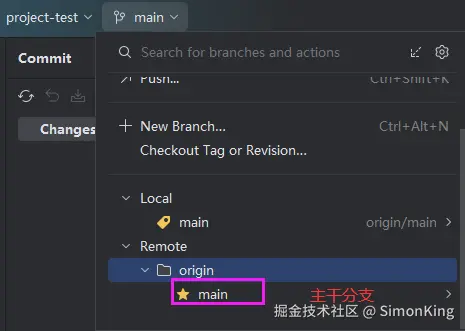 一个新的项目开始,我们需要从主干分支上拉取开发分支。我们还是以上一期的project-test 仓库为例。