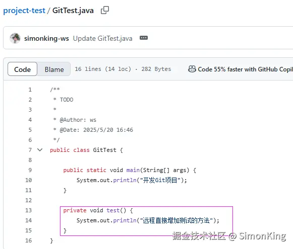 为了制造冲突,直接在GitHub上修改GitTest.java文件。