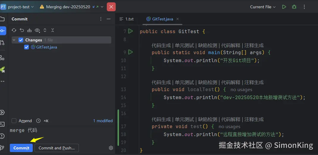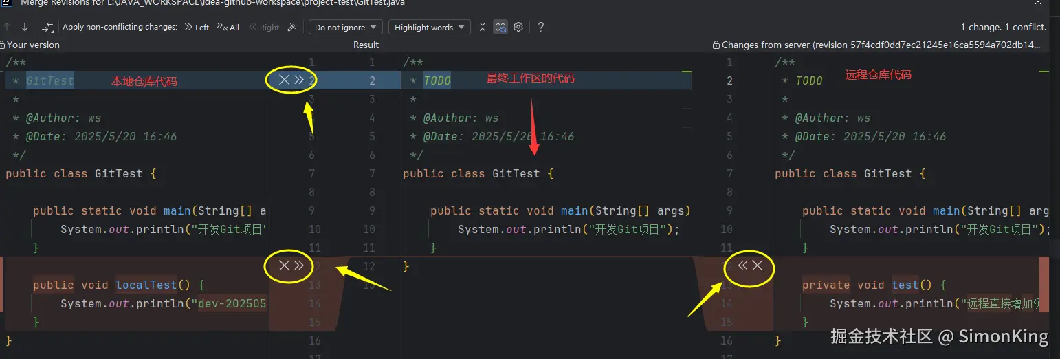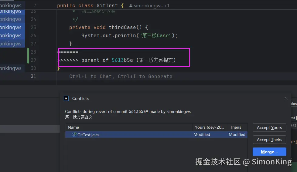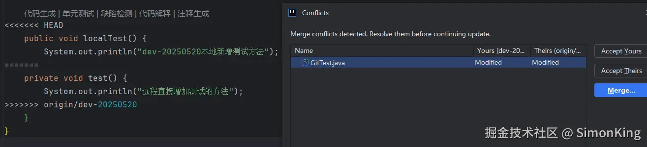 选择Merge之后,Git会自动从远程仓库拉取最新的代码,并在工作区标记处冲突的位置(如上图)。我们通过Idea继续Merge处理冲突。