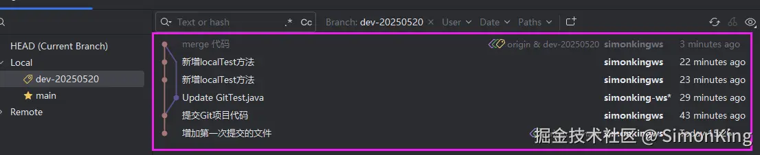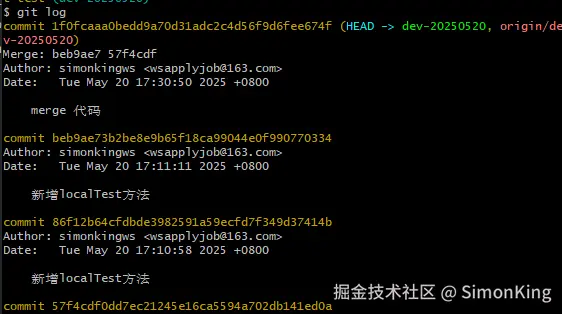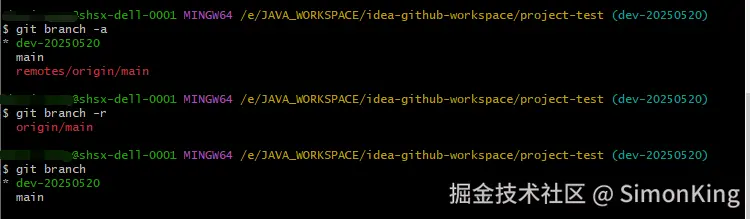 案例中我们一直在dev-20250520开发,我们将开发分支合并到主干(main)分支上。首先我们需要需要切换分支到主干分支上。