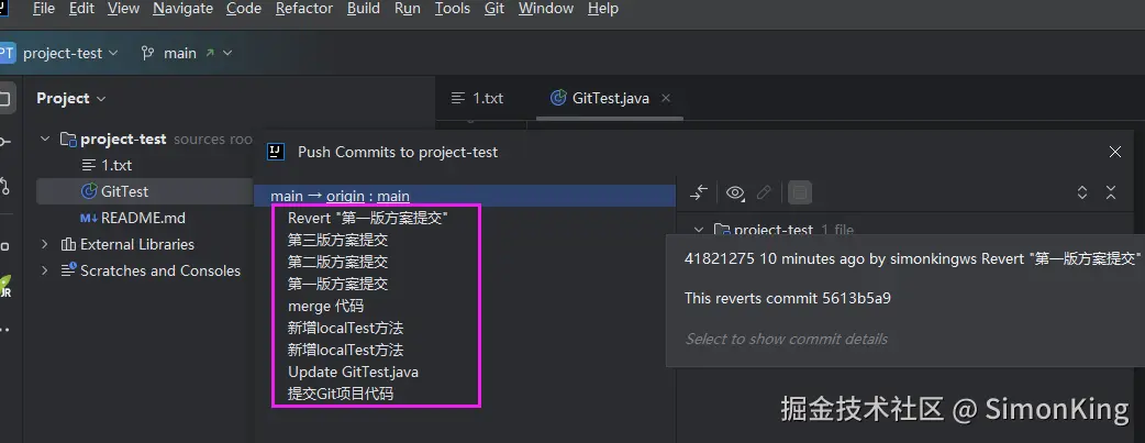 本地修改同一个文件(GitTest.java),提交本地仓库没有冲突,但是推送远程仓库时,就会出现冲突。