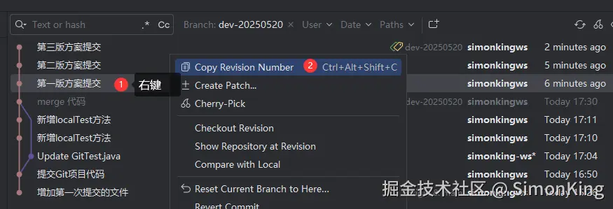 选中第一版记录,然后右键复制版本号