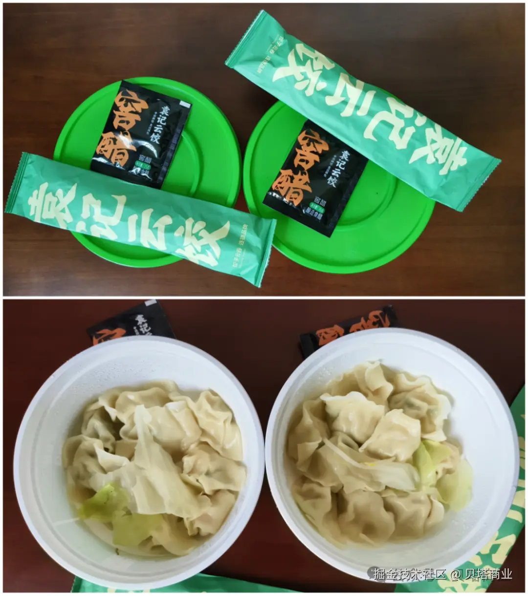 袁记云饺和个体户做的云吞水饺相比,算是比较“高贵”的品牌(重点在后一个字),但是我们发现,上了拼好饭和加入外卖大战后,十块钱也能搞来一份双拼云吞,性价比陡然上升。而我们这次选择的是新品鲜虾黄鱼饺十个,经典白灼口味。