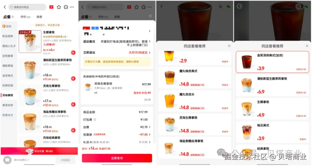 同样的情况也出现在茶饮领域。一杯库迪的生椰拿铁在两个平台都是4.9元,不过拼好饭可以6.9买一杯潘帕斯蓝生酪茉莉拿铁,京东外卖需要11.99元;一杯联动活动的灵珠生椰拿铁在京东标注到手价10.99元,加上打包费和运费减掉优惠券变成14.69元,而拼好饭直接就是14.8元。