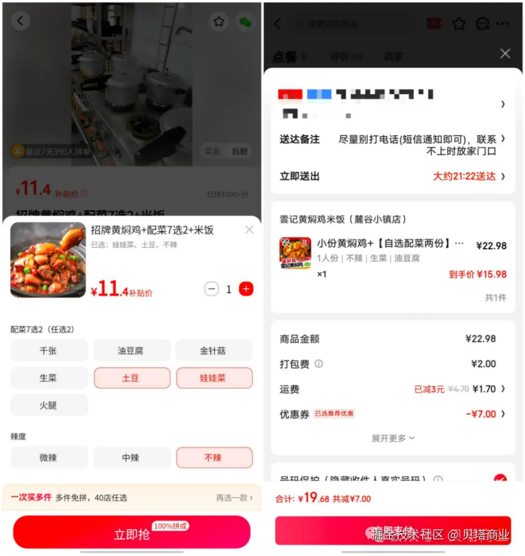 而价格呢?左边10元,右边12.5元,右边还用了十元券。单算性价比,依然是拼好饭获胜。