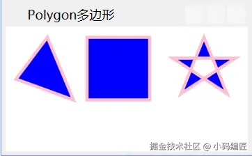 Polygon:多边形(闭合),由多条直线段围成的闭合区域,有笔触和填充