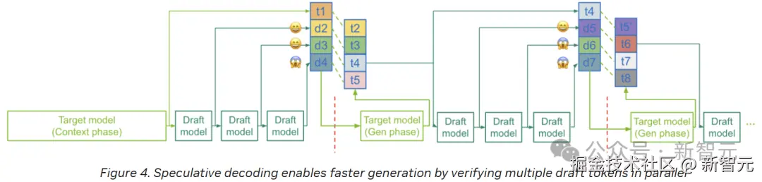 这个循环不断重复:被接受的 token 得以保留;若发生拒绝(例如,在 d4 被拒绝后),目标模型会提供正确的下一个 token(如 t4);然后,草稿模型会生成一个新的推测序列(例如 d5-d7)。