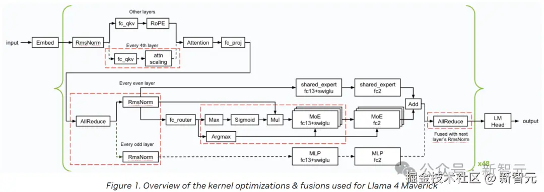 下图概述了英伟达在推理过程中应用的内核优化和融合(以红色虚线框标示)。