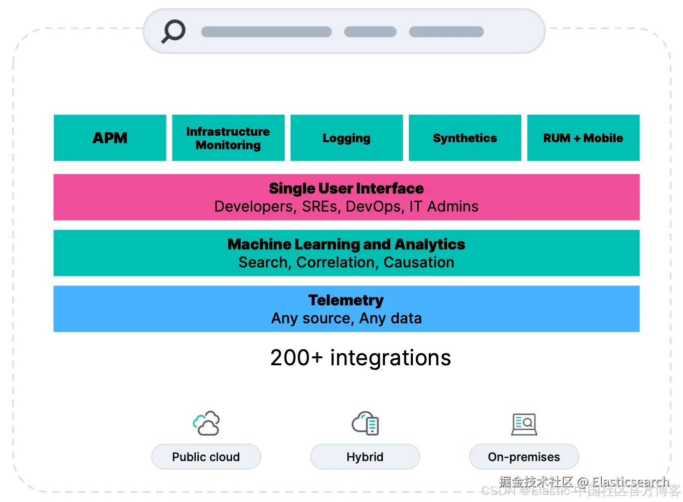 Elastic Observability 构建于 Elastic Stack 之上,借助搜索能力帮助组织关联无限遥测数据,将数据转化为结果。在统一的体验中,Elastic Observability 提供对 AWS、Microsoft Azure 和 Google Cloud 等云环境的可见性,集成简便、数据接入顺畅。