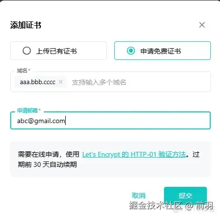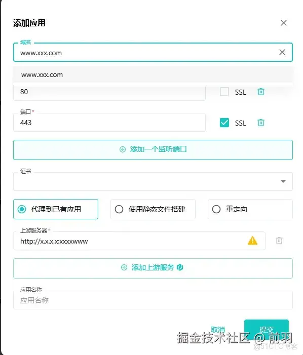 按照下图配置即可,把域名证书选择我们刚刚之前申请的证书。