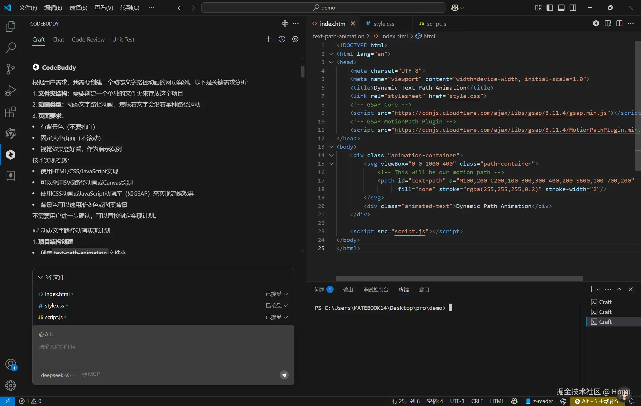 想为个人博客做一个小动画:让标题“Dynamic Path Animation”沿着一条优美的曲线流动,像文字在波浪上跳跃。但作为一个半吊子前端新手,我只知道需要用SVG和动画库,具体怎么实现却毫无头绪。抱着试试看的心态,我打开了CodeBuddy——那个传说中能“听懂人话”的AI编程助手。