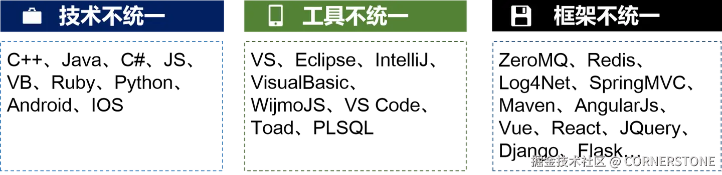 技术架构不统一,将提高运维人员的技术门槛,使运维人员疲于学习新知识;同时增加信息化部门的运维难度,需要更多专业的人来维护系统正常运行;增加运维成本,需要众多外援的持续技术支持,使自身运维能力减弱。
