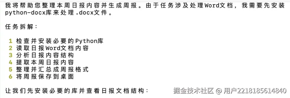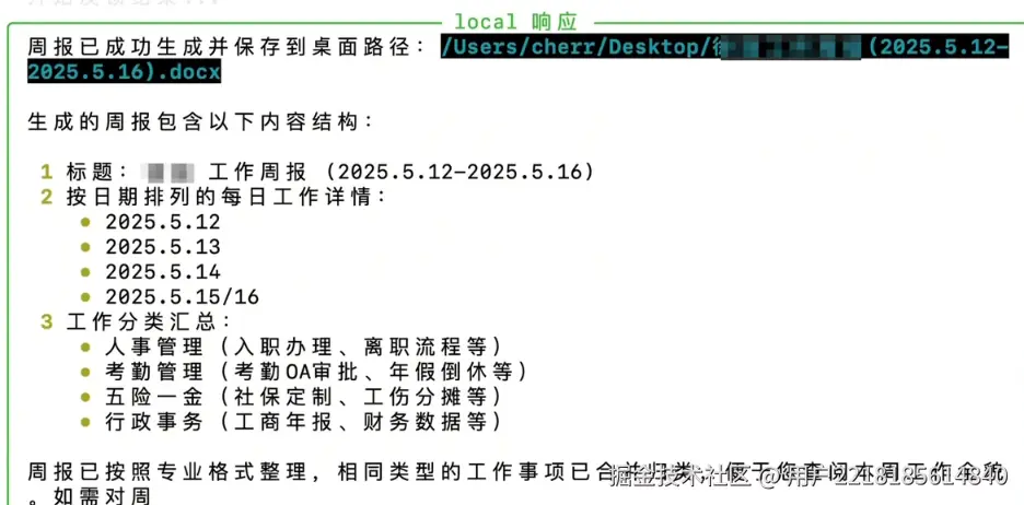 提示词:请帮我整理一下本周日报内容,形成本周周报并保存至桌面,日报内容地址:……