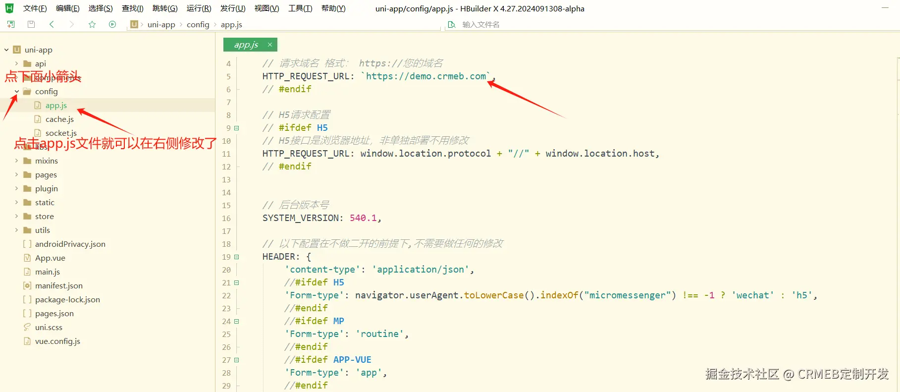 1.打开template/uni-app下config/app.js修改接口地址,将下图红框中的地址修改成您的域名