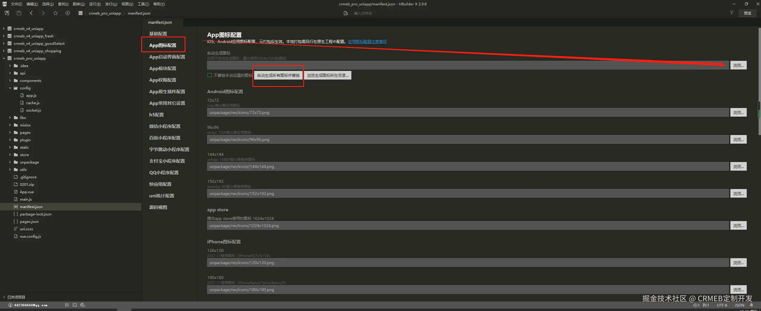 2.点击《App图标配置》,上传APP的图标文件,图标必须是1024*1024大小,png格式,直角边,非透明,点击《自动生成所有图标并替换》