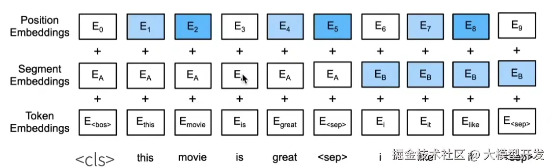 - 段嵌入(Segment Embeddings) :区分句子对中的不同句子(用于 NSP 任务)。